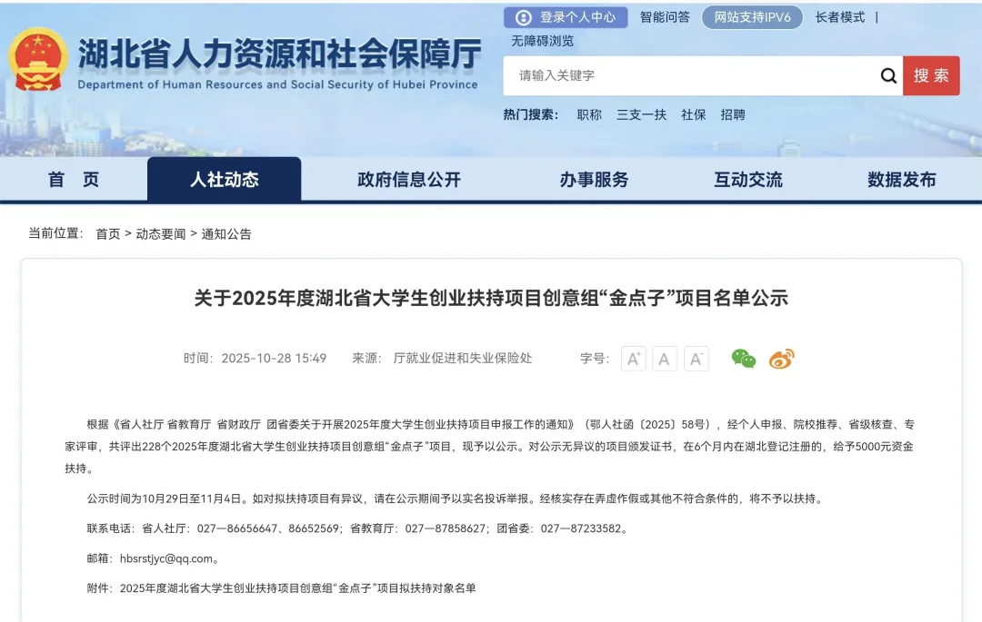 近日,湖北省人力资源和社会保障厅公布了2025年度湖北省大学生创业扶持项目创意组“金点子”项目拟扶持对象名单,我院1个项目入围。省人社厅将对6个月内在湖北登记注册公司的项目给予5000元/项资金扶持。
